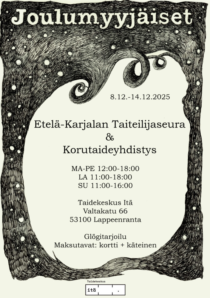 Taidekeskus Idässä järjestetään koko viikon mittaiset joulumyyjäiset maanantaista sunnuntaihin 8.12.-14.12.2025. Esillä on runsas kattaus Etelä-Karjalan Taiteilijaseuran sekä Korutaideyhdistyksen jäsenten teoksia, muun muassa maalauksia, veistoksia, koruja, piirroksia ja kortteja. Myös taidelainaamo palvelee normaalisti. Itä on auki maanantaista perjantaihin klo 12-18, lauantaina 11-18 ja sunnuntaina 11-16. Maksutapoina käyvät käteinen sekä kortti. Tarjolla myös kuppi kuumaa glögiä ja iloista joulumieltä. Tervetuloa joiluostoksille!